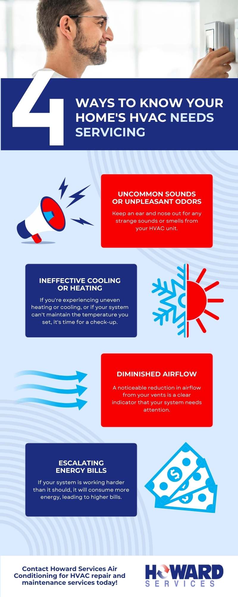 Maintaining a comfortable and energy-efficient home in Florida requires regular HVAC servicing. Neglecting this crucial maintenance can lead to increased energy bills and a decline in indoor air quality. In this blog post, our team at Howard Services Air Conditioning, Jacksonville’s trusted HVAC contractor, will discuss four clear signs that indicate your home’s HVAC system is in need of servicing. Learn more below, and contact us for all your residential HVAC needs!