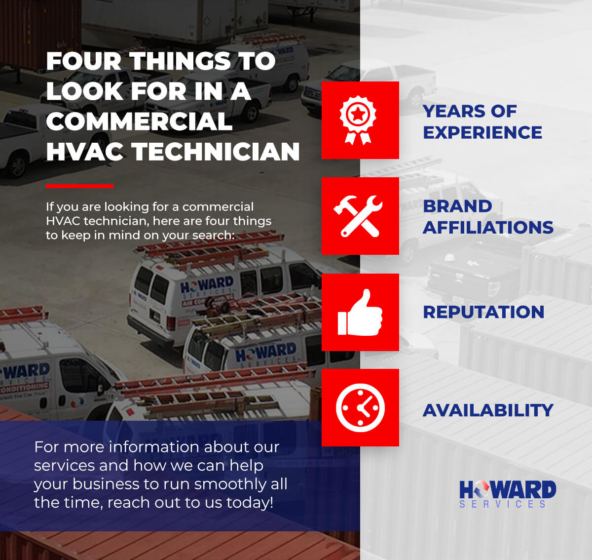 If you are looking for an air conditioning company you can trust, Howard Services is here to provide HVAC services you need. For more information about our services and how we can help your business to run smoothly all the time, reach out to us today!