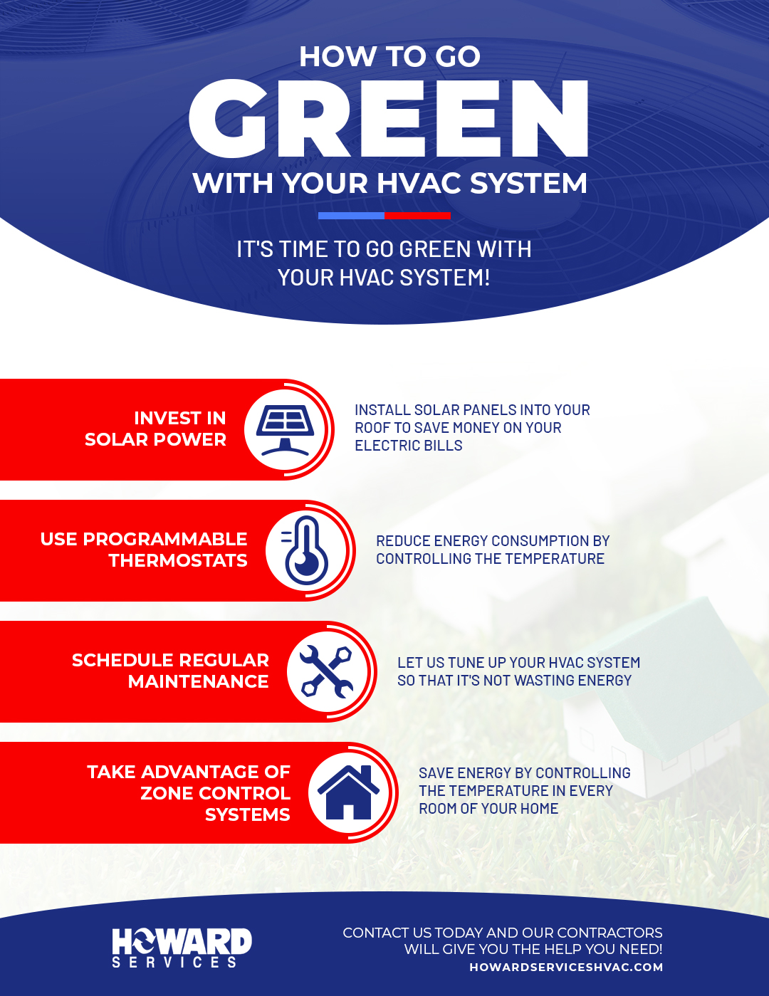 It’s time to go green with your HVAC system! Going green is one of the best ways to reduce energy consumption and save money on monthly energy bills. At Howard Services, we can help you with any of your residential or commercial HVAC needs. Check out these tips to make your HVAC system more energy efficient!