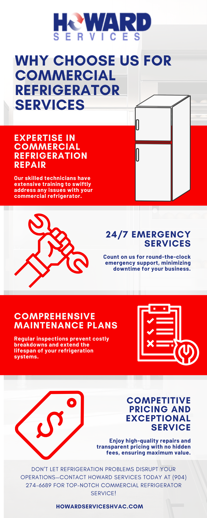 Choosing Howard Services for your commercial refrigerator repair needs ensures you benefit from expertise, prompt emergency responses, comprehensive maintenance, and competitive pricing. Don’t let refrigeration issues disrupt your business—contact us today to schedule your appointment!